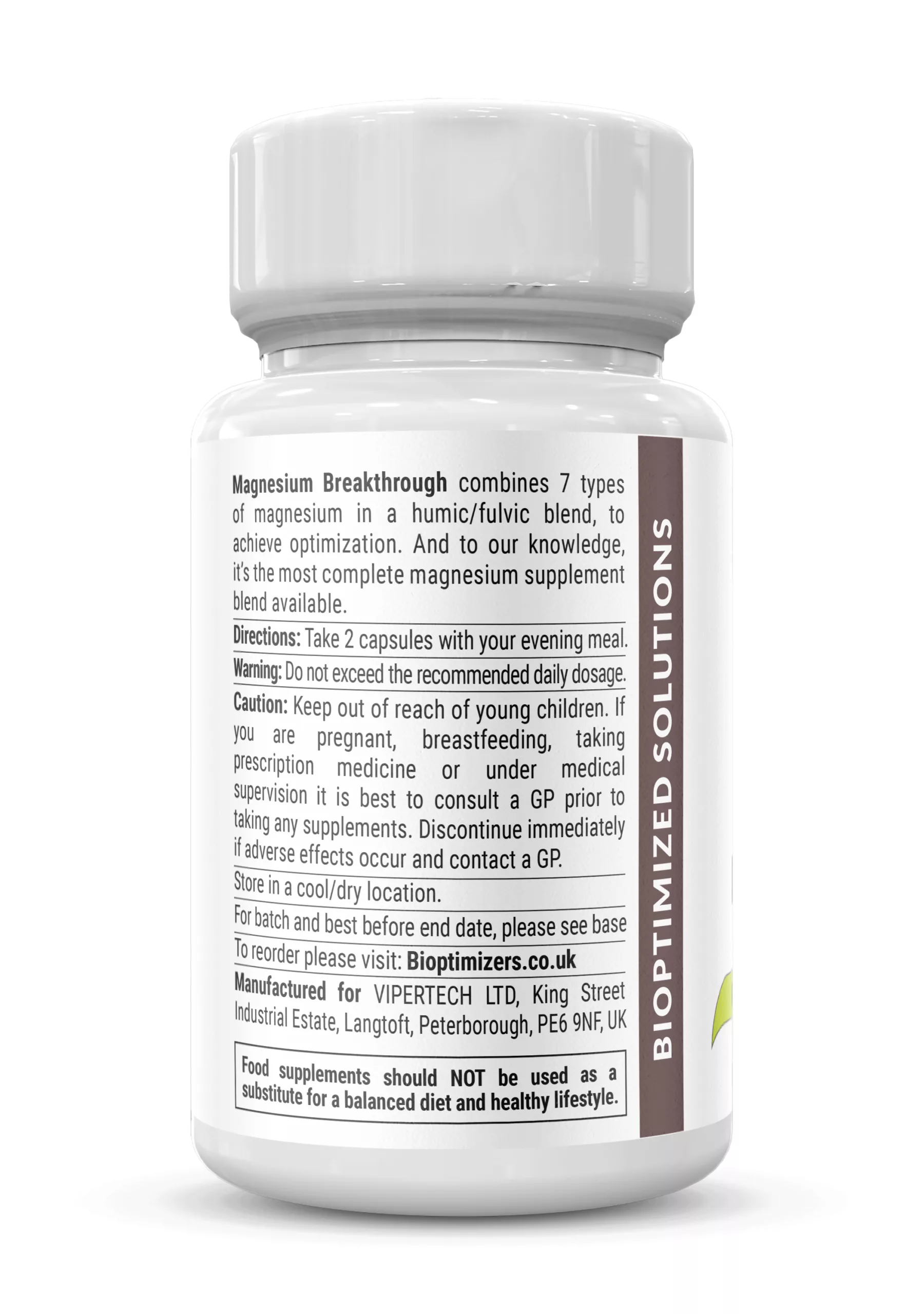 Magnesium Breakthrough by BiOptimizers is the ultimate magnesium supplement delivering all 7 major forms of magnesium, delivering the full range of magnesium-related health benefits to your body. Each strain of magnesium is different and provides a unique advantage – with Magnesium Breakthrough, you can feel them all in one super supplement.