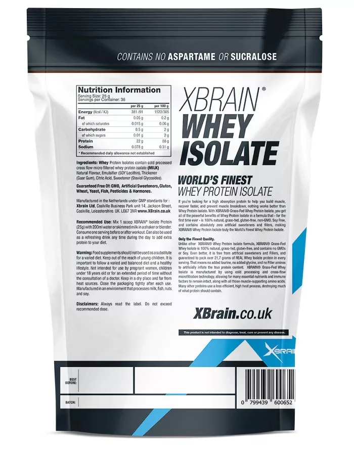 When it comes to quality, many whey isolate products fall short of the mark, but XBRAIN® Whey Protein Isolate is 100% natural, gluten-free, and contains no GMOs. Unlike other whey isolate protein mixes, XBrain’s world class formula is completely free from artificial sweeteners and fillers, guaranteed to pack over 20,7 grams of REAL Whey Isolate protein per helping. This means a formula with absolutely no added taurine, no added glycine, and no filler aminos commonly used in other mixes to artificially enhance the actual protein content.